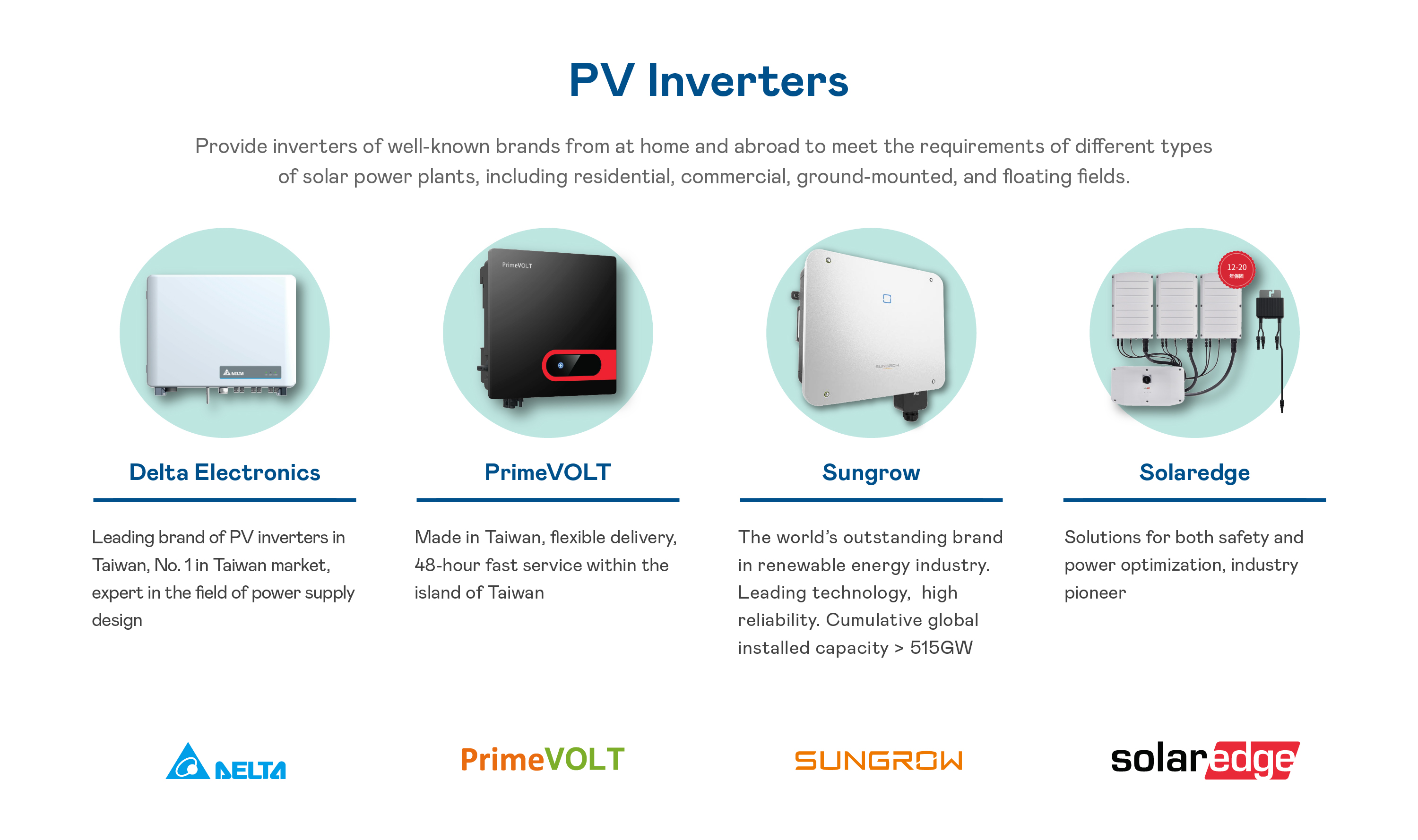 With its "one-stop shopping" service, AUO not only possesses its own solar modules, monitoring, software and hardware integration solutions, it also provides other reliable, high-quality components and products for the solar power plants of customers, including important components, such as converters, connectors, wires and cables, and component products, such as environmental monitoring devices, related auxiliary materials and tools.
